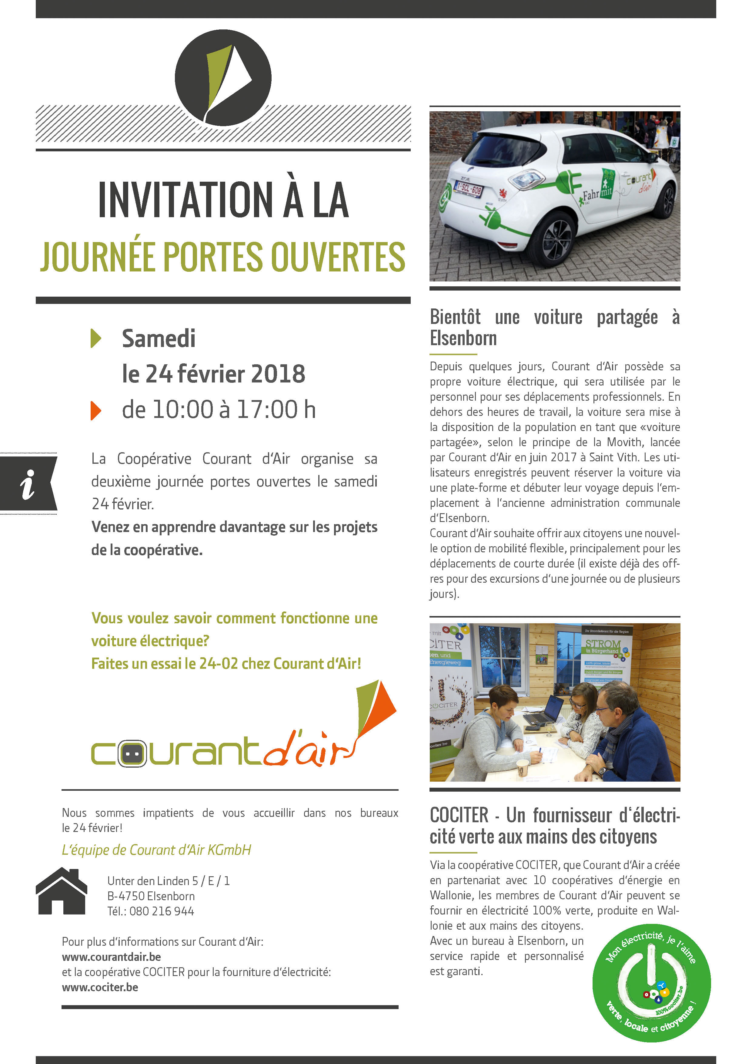 Via la coopérative COCITER, que Courant d’Air a créée en partenariat avec 10 coopératives d’énergie en Wallonie, les membres de Courant d’Air peuvent se fournir en électricité 100% verte, produite en Wallonie et aux mains des citoyens. Avec un bureau à Elsenborn, un service rapide et personnalisé est garanti.