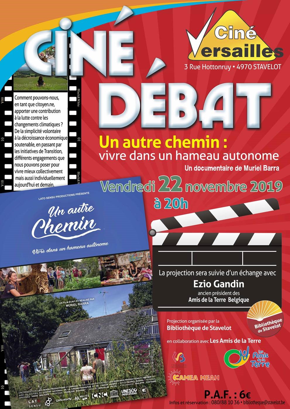 Ciné débat organisé le vendredi 22 novembre à 20h au Ciné Versailles sur le thème de la transition et des choix de vie en autonomie, en collaboration avec Les Amis de la Terre et Kamea Meah.